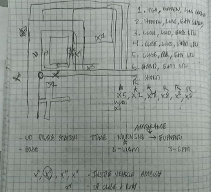 Усередині блокнота поліція знайшла схему будівлі поліцейського відділку Університету Делаверу, яка включала маршрути входу та виходу, нотатки щодо тактики та способів уникнення виявлення правоохоронними органами.