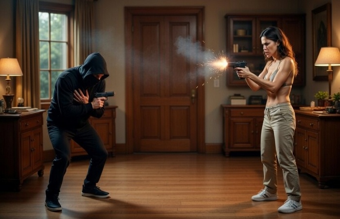 Почувши шум, дружина підприємця, яка володіє зброєю на законних підставах (категорія CAC), вийшла назустріч грабіжникам з пістолетом. Коли один із них спробував прорватися в будинок, жінка відкрила вогонь на ураження.